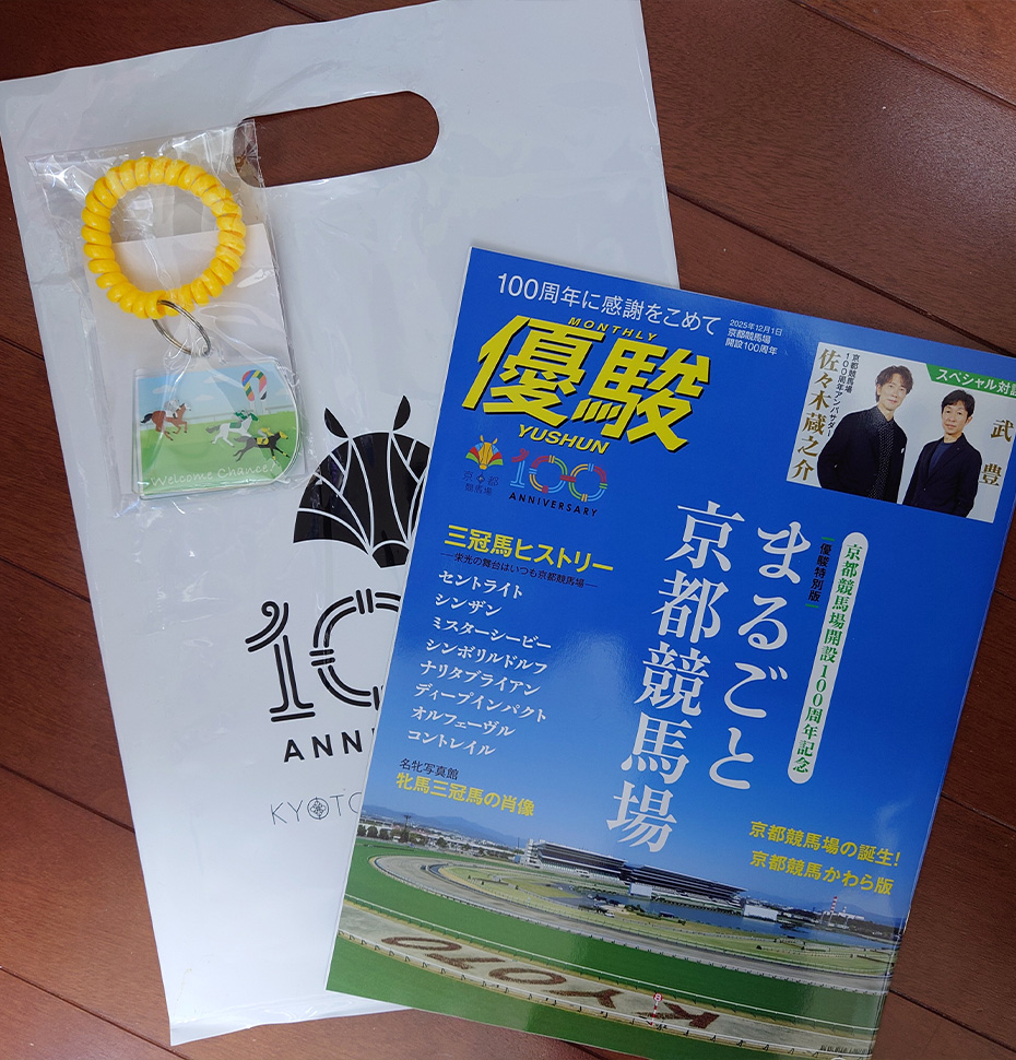 京都競馬場が100周年ということで、先着10000名様に「優駿」の特別号が配られていたのでいただきました。これもらうのにイベント用アプリをインストールして、アンケート入力して、参加番号表示してというのがあったのでちょっと面倒でした。このせいもあってか余ってたみたいで帰りには普通に配ってました。Welcomeチャンスという企画もあって、抽選でちょっとしたプレゼントが当たるというものだけど、これはこれでまた別のアプリを入れないといけなくて、もともとJRAのアプリもあるし、「統一してー!」と思いました。