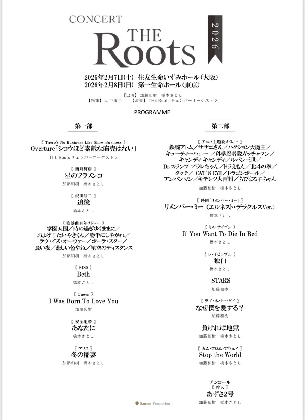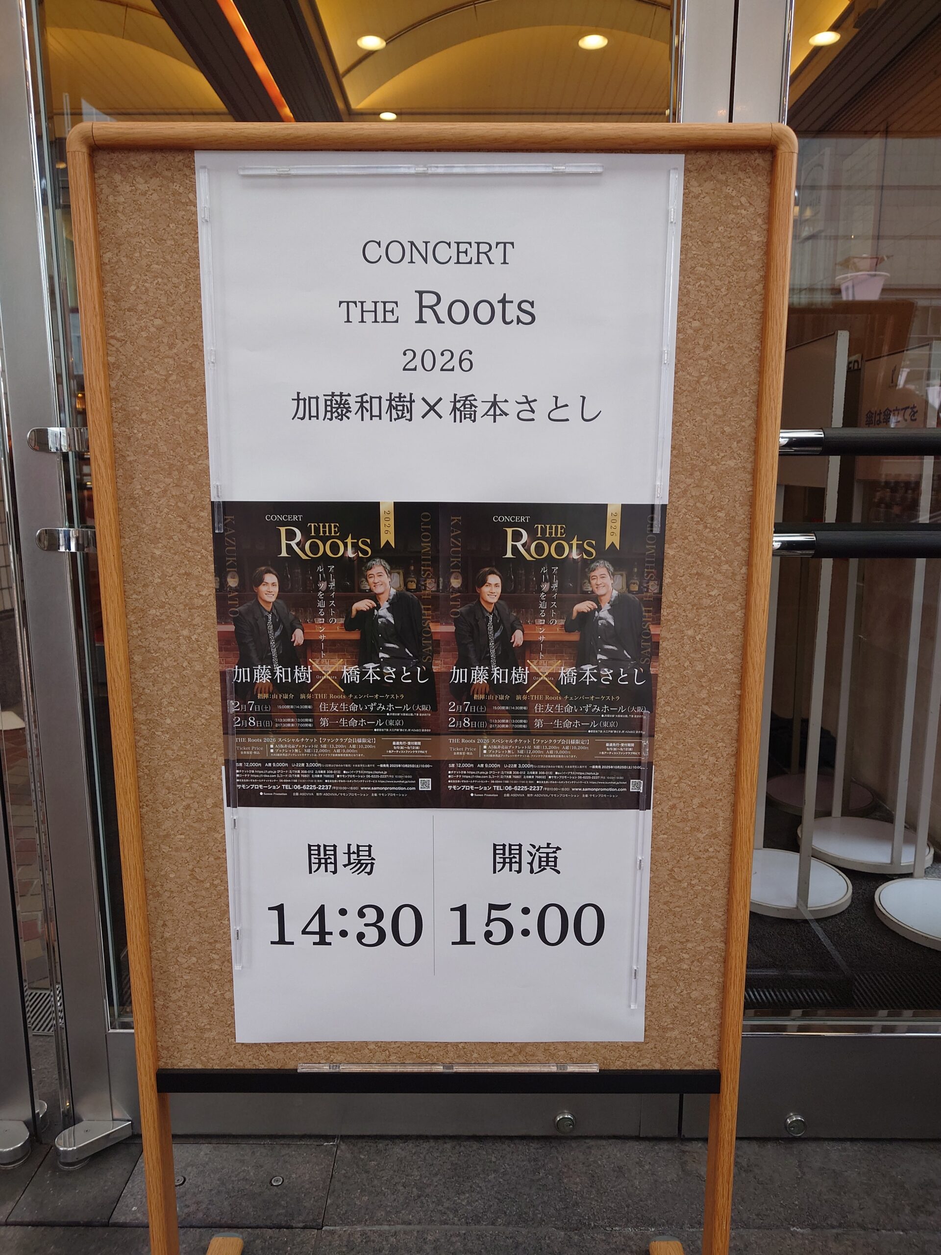 いずみホールへ加藤和樹さんと橋本さとしさんのコンサート「THE Roots2026」へ娘と行ってきました。前に朝夏まなとさんとの「The Roots 2022」に行った際、公演が完了するまでネタバレ禁止だったので、今回も念のため東京公演が終わるまで記事を置いておくことに。