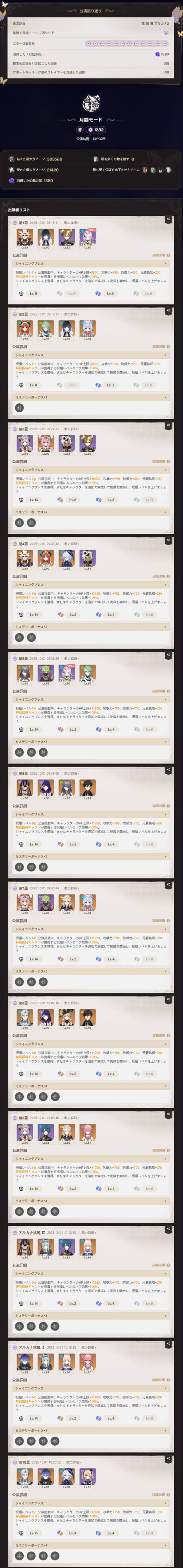 「幻想シアター」、今回から「月諭モード」というのが新たに登場し、既にそれが選択されていました。なので、そのまま月諭モードで行ってみました。2戦増えるので、キャラのやりくりが大丈夫かなぁと思ったので、とりあえず9幕まで不通に進んで10幕のキャラを決めてから残りのキャラでアルカナ2戦に臨みました。10幕はヌヴィレット&フリーナ、アルカナ戦のマッシュラプトルはセノ、もう片方は月感電組で行けたらなという構想で進めてたのですが、まぁまぁ予定通りいけました。