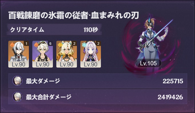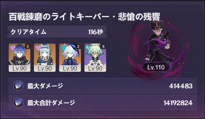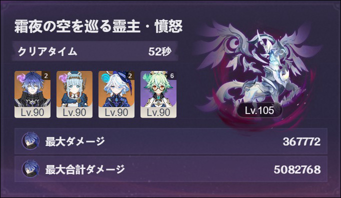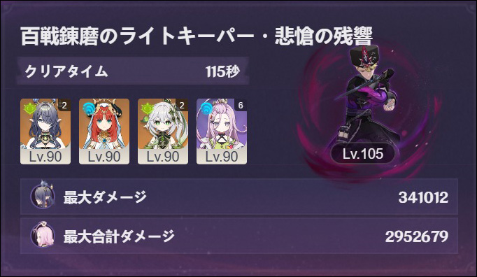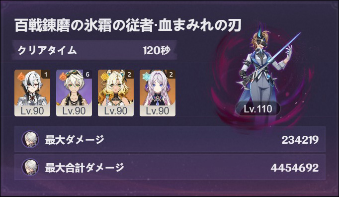 アルレッキーノは娘と同じ編成で凸状況は私の方がシトラリの凸が進んでるのに、娘は割と楽にクリアできたのに比べ、私は結構苦労しました。アルレッキーノの会心ダメとか会心率が彼女より20%くらい低かったので、聖遺物をちょっと更新してみたり、アドバイスに従って炎杯を攻撃杯にしてみたりして、やっとクリアできたのでした。(120秒ギリギリ!)