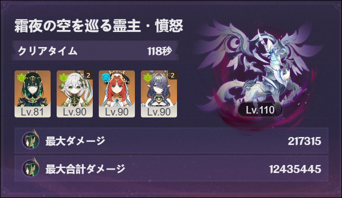 最後まで残ったのが霊主。ネフェルのスキル天賦が8の時に、息子が私のデータでプレイしてあと1cmくらいまで削れてたので、10にしたらクリアできそう?って思ったのですが、10にしても私がやったら全然ダメで。プレイヤースキルの差がまたしても出てましたね。で、ナヒーダの爆発回すのに元チャが欲しいのでモチ武器じゃなくてリュートを持たしてみたり、ニィロウに教官持たせたり、あれやこれや試して、やっとクリアに至ったのでした。もともとはニィロウじゃなくてアイノでやってたのだけど、ニィロウの方が何かいい感じだったので、最終的にはニィロウでやってました。無凸なので多分すぐ水が無くなってたんじゃないかと思うけど。
