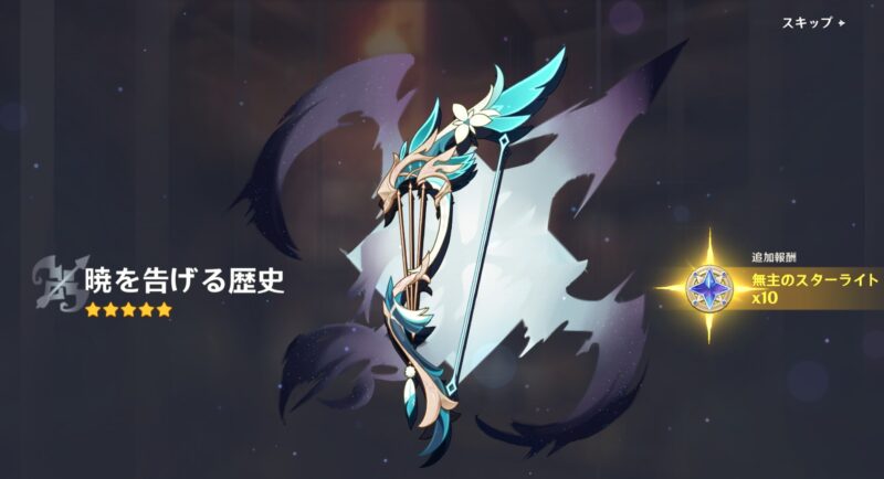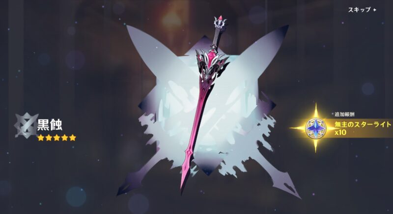 武器ガチャは最初、黒蝕を軌定にしてすり抜けずに来たのですが、次に暁を告げる歴史を軌定にしたときに、「黒蝕」すり抜けの「暁~」となって、「最初からこっちで良かったやん」となりました。