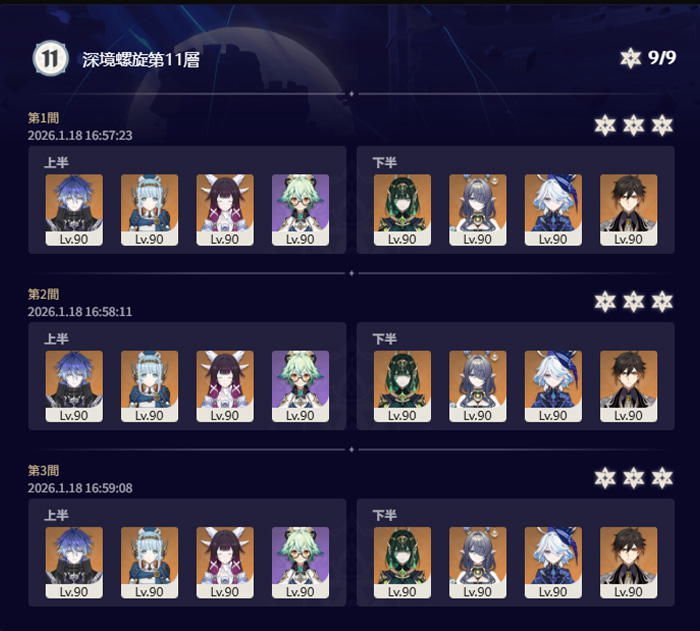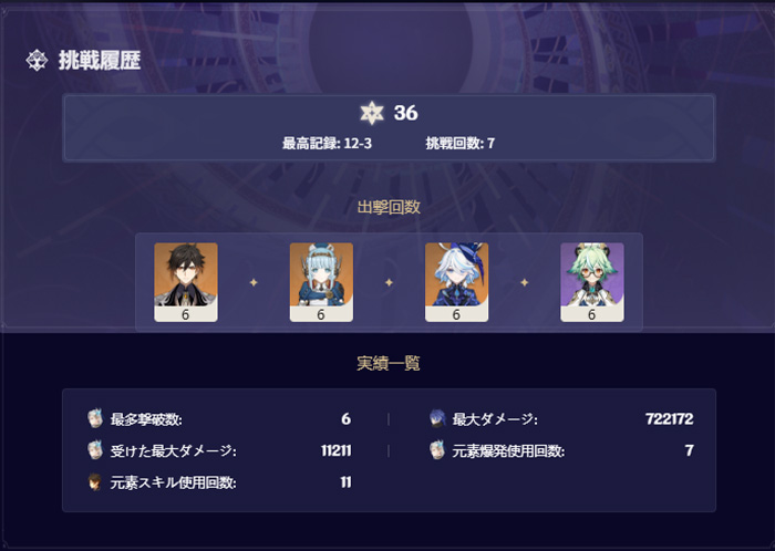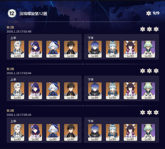 そして、16日には螺旋も更新されたということで、ちょっと遅れたけど今日やってきました。今回は特にめんどいギミックもなかったし、合うキャラが揃ってるのもあって割と楽でした。コロンビーナはまだ育成途中だけどとりあえず入れてみました。
