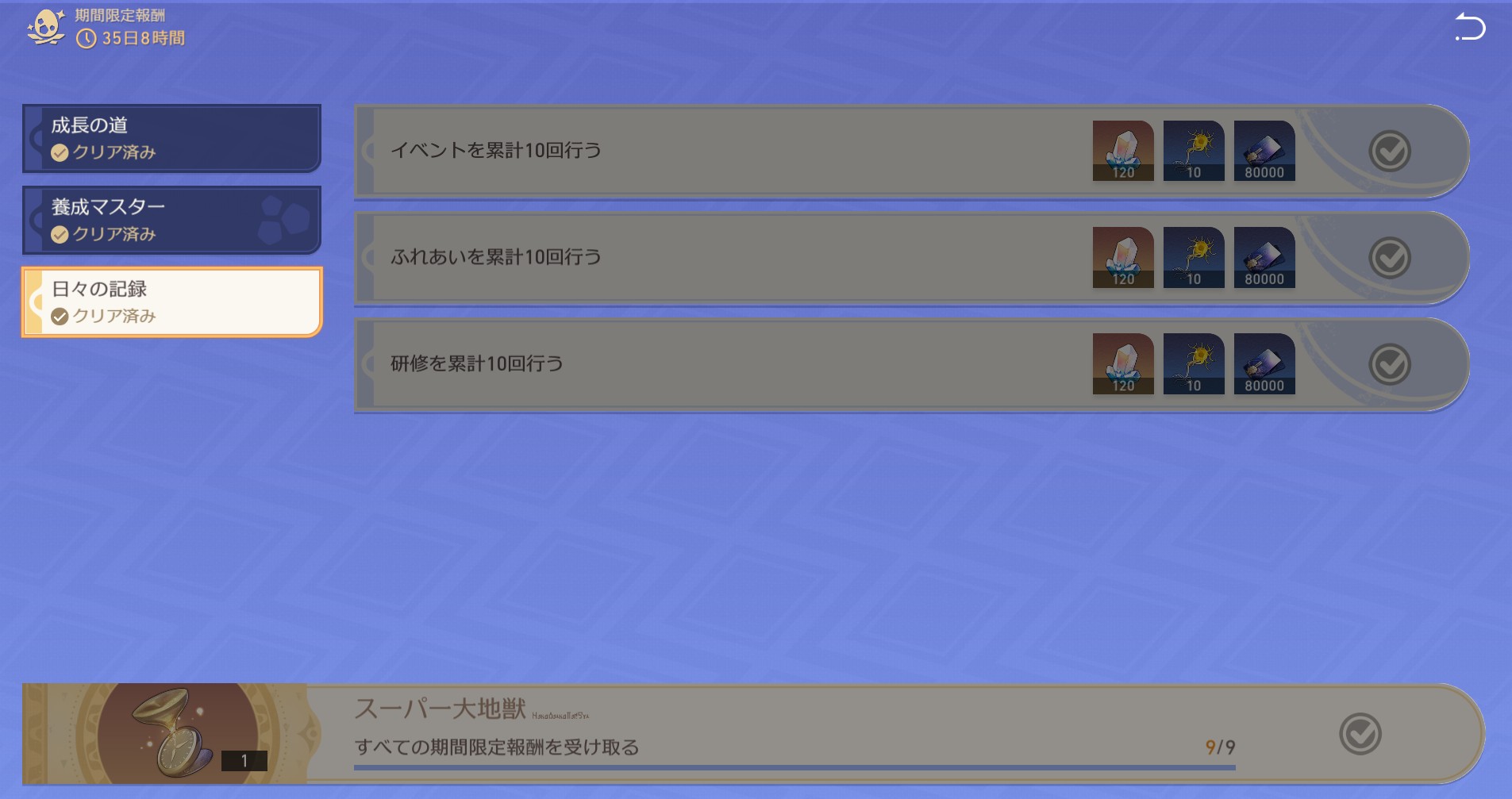ストーリー終わったので、大地獣育てるイベントも一気に終わらせました。途中からトレーニングとか試験とか自分でやってくれるのありがたかったです。