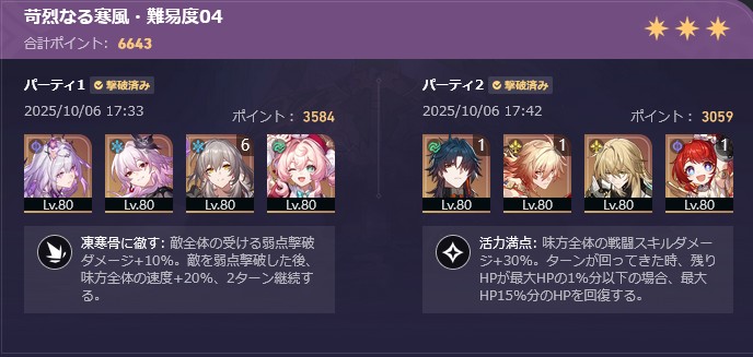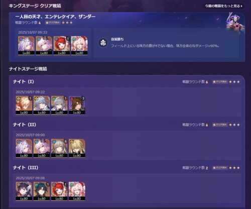 こちらは3パーティということで、パズルみたいにあーでもない、こーでもないとやってました。ナイト2が難しくて、最初キャストリスと長夜月はナイト3だったのだけど、ナイト2を押し切ってもらうしかないなということでナイト2に持ってきたら、なんとか★1でクリア。
