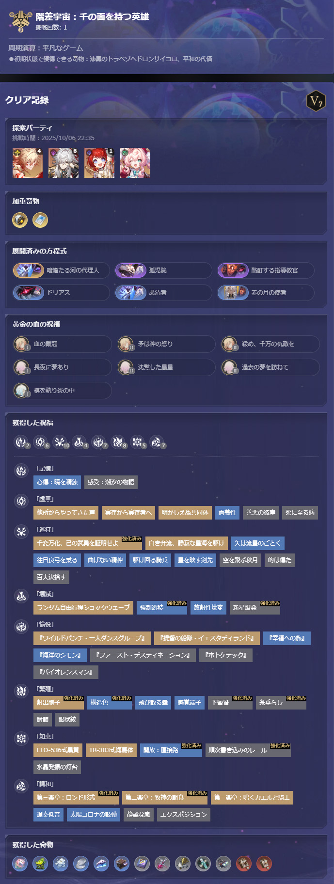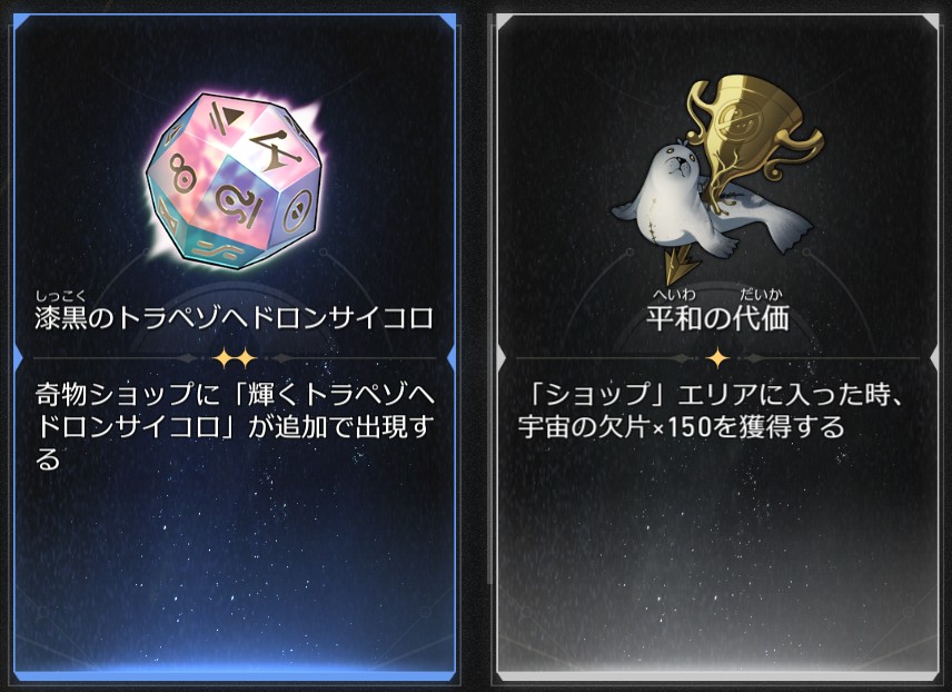 「漆黒のトラペゾヘドロンサイコロ」と「平和の代価」で、トラペゾはショップに「輝くトラペゾヘドロンサイコロ」が追加で出てくるというものですが、奇物が全部入れ替わるので、結局1回も購入することなく終わりました。アチーブとかミッションとかそういう目的がある時は使えるけども。あと使いようによっては強いデータを作れるとかね。今回は特にそういう目的もなかったので。