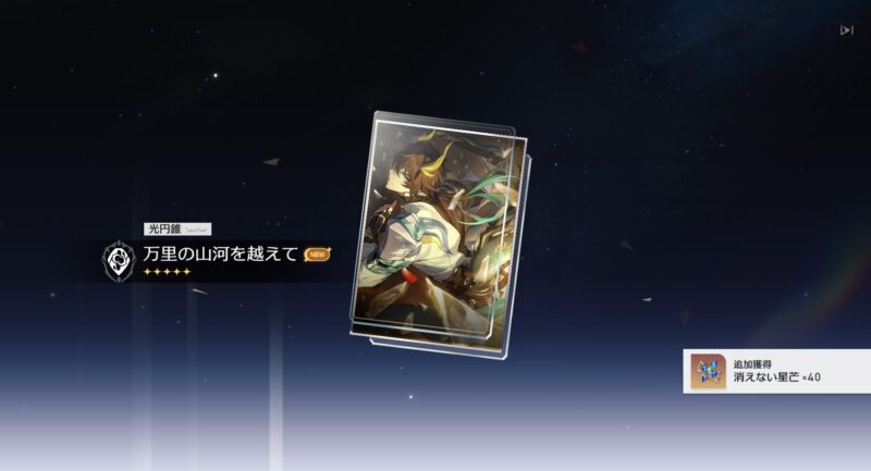 それと、バージョン3.6の後半スタートということでガチャも更新されましたが、今回の新キャラ「丹恒・騰荒」が配布だったので、光円錐のみ引いてきました。でもねぇ、「あ、光ったー、存護や!……ジェパード餅・・・」ということで、見事にすり抜けたのでした。でも★4が比較的たくさん出た感じ。そして雪衣と寒鴉が来るというなかなか熱い展開でした。