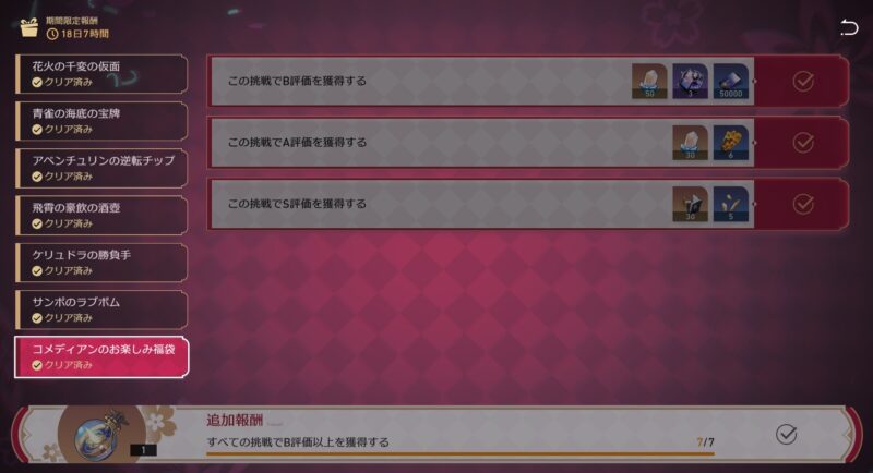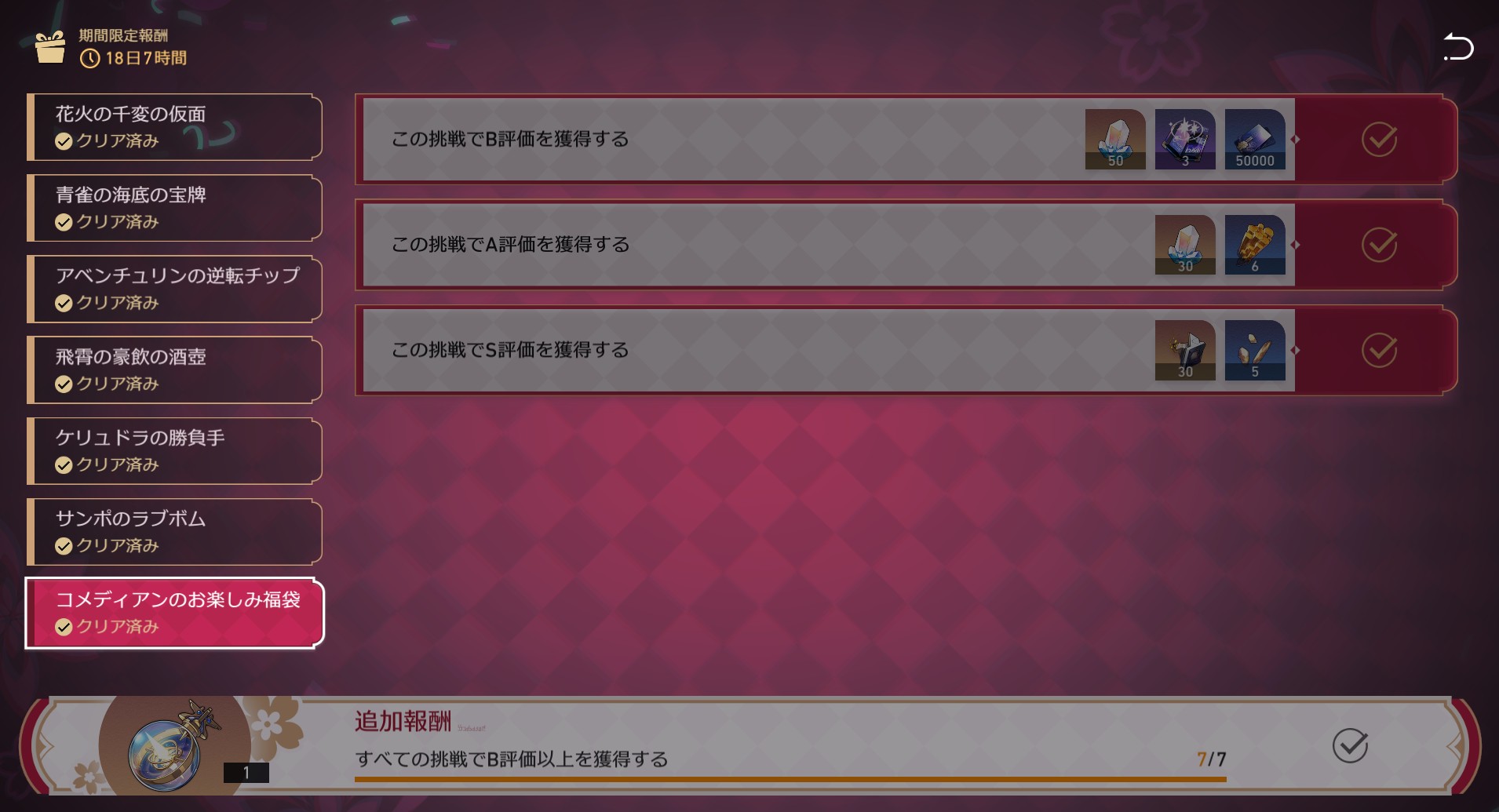 サブ垢は全てお試しキャラで行ってSまたはSSクリアというところ。Sが取れれば報酬もらえるので親切設計でしたね。