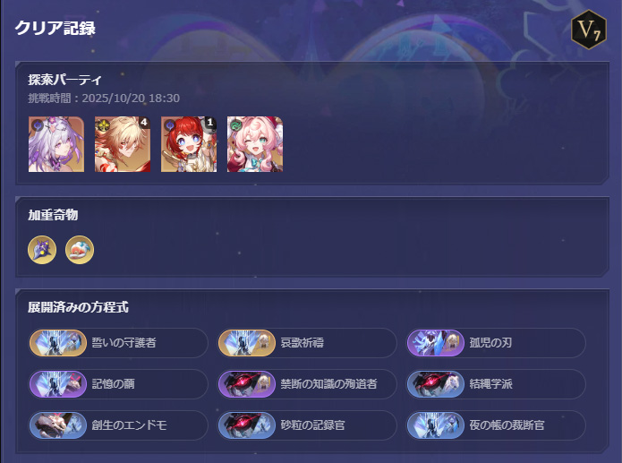 周期演算行ってきました。ボスがボリュクスなので、キャストリスかな~と。ボリュクスの弱点が風、量子、虚数なので、モーディスも使えるし、いつものトリビー&ヒアンシーも合うし、無駄のない編成。普通に強いので道中も特に困ることなくクリアできました。