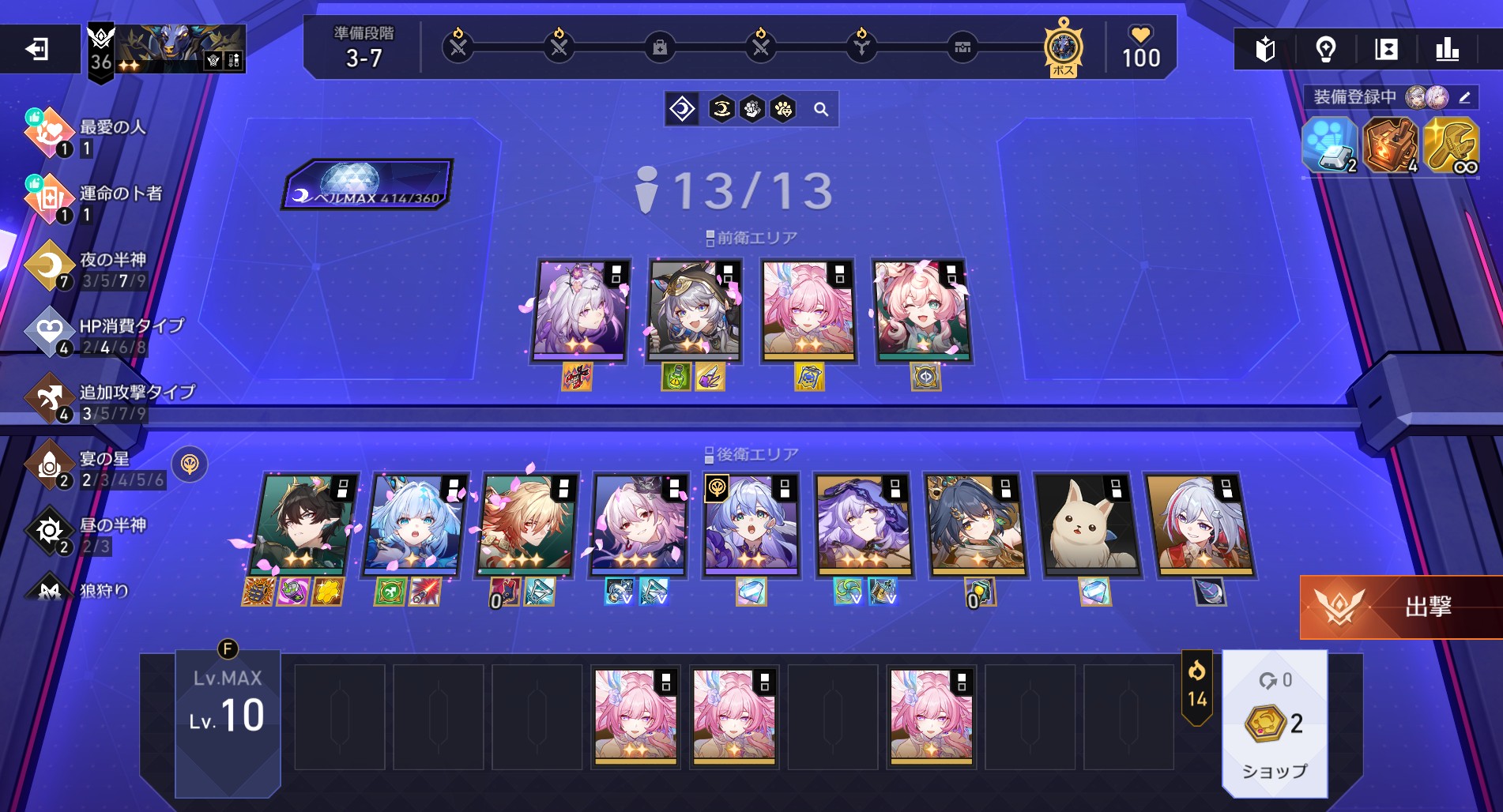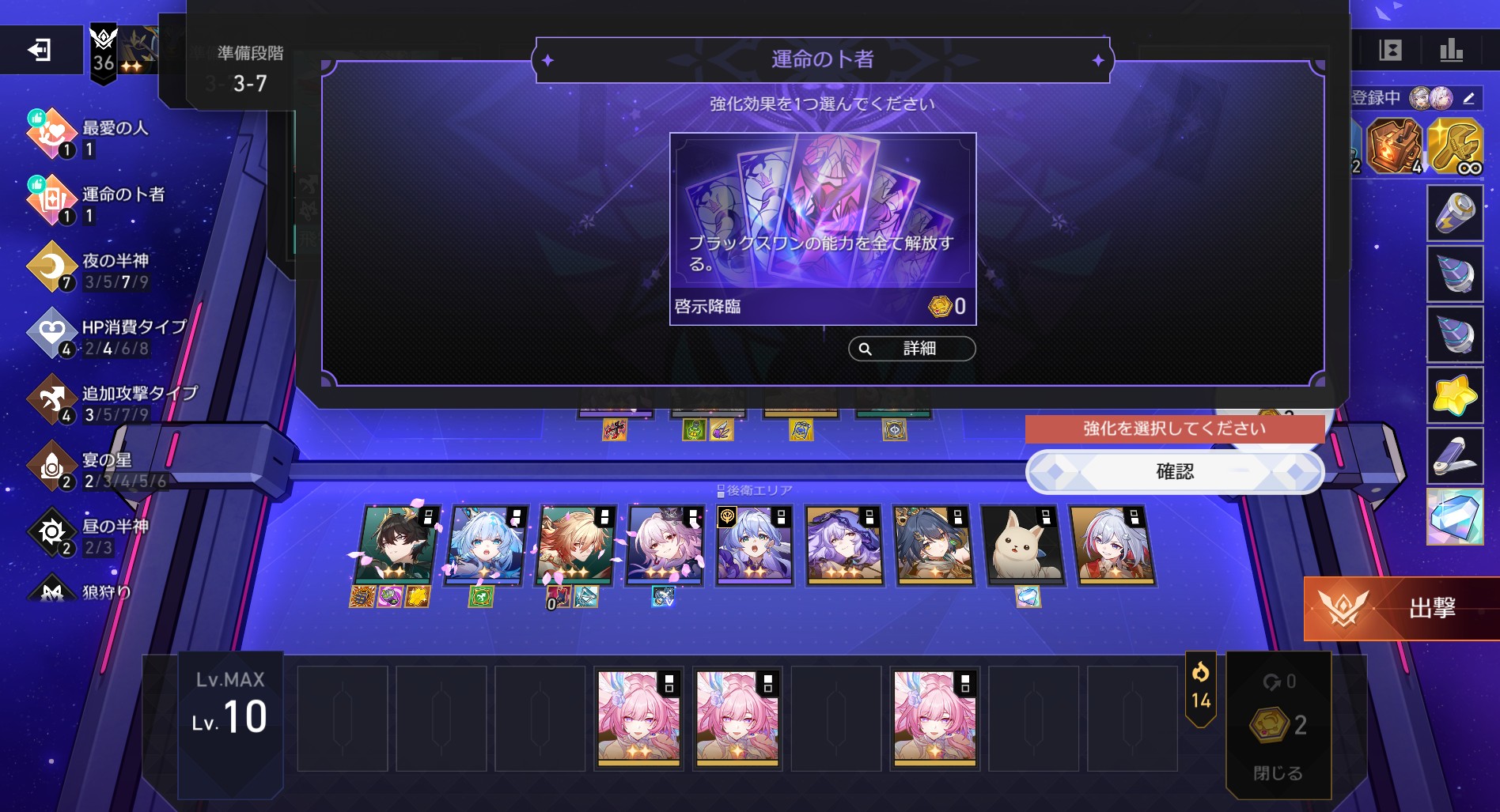 この最高級報酬がなかなか豪華で、金色のをいっぱいくれたので、そのおかげで、ブラックスワンが★3になって、「重なる絆」の「占いカード強化をすべて獲得する」や、「究極の挑戦」の「パーティ規模が13名以上」というのも一緒に達成できて、なかなかお得な感じになりました。キュレネもあと1人来てくれたら★3にできたんだけどなぁ。