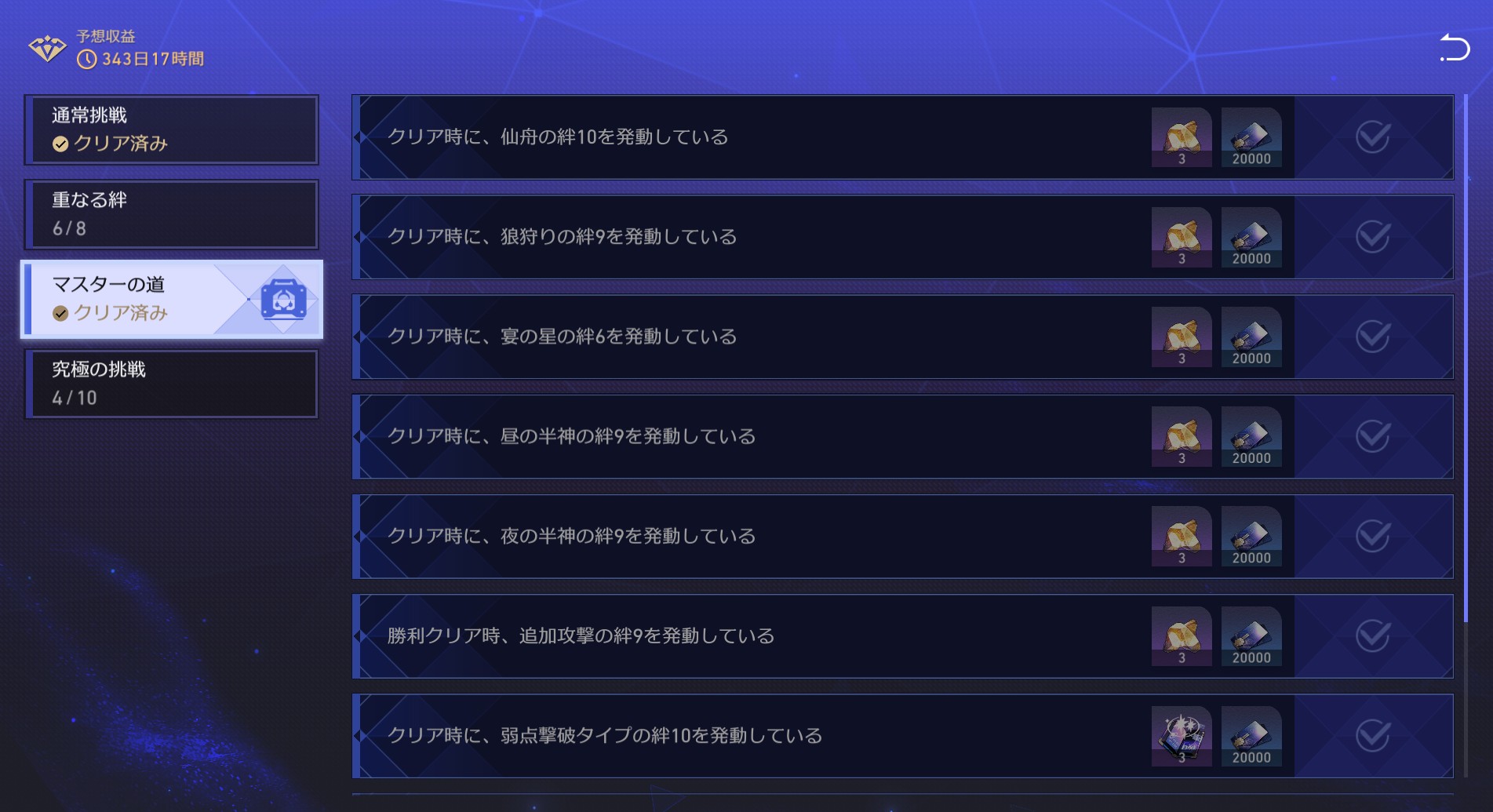 あとはまだ「重なる絆」が2つ残ってるし、「究極の挑戦」も半分以上残ってるので、またぼちぼちチャレンジしていきたいと思います。