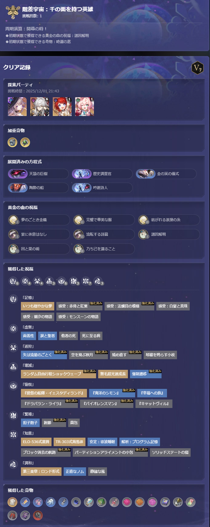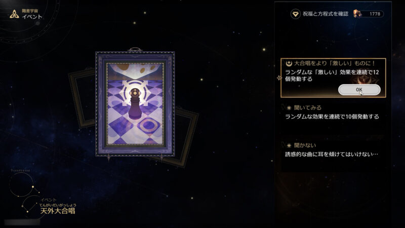 獲得したもの→★1祝福×5、不利奇物×4、★1奇物×2、★2奇物×2、宇宙の欠片 70個