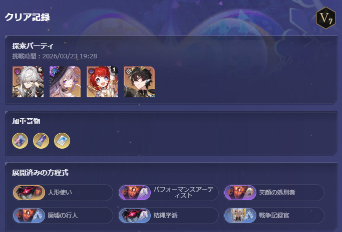 3回とも同じパーティだったのですが、今回は方程式も展開できてたし、順調にクリアまでいけました。最新キャラだと方程式無くてもゴリ押せたりしますが、景元だと完凸しててもやはり方程式の後押しが欲しい感じ。強化来ないかな~。