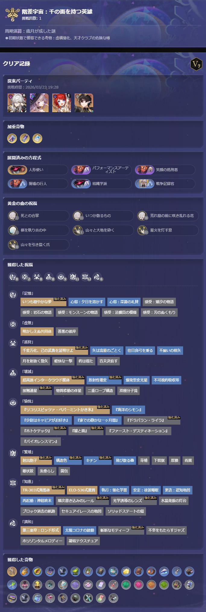 3回とも同じパーティだったのですが、今回は方程式も展開できてたし、順調にクリアまでいけました。最新キャラだと方程式無くてもゴリ押せたりしますが、景元だと完凸しててもやはり方程式の後押しが欲しい感じ。強化来ないかな~。
